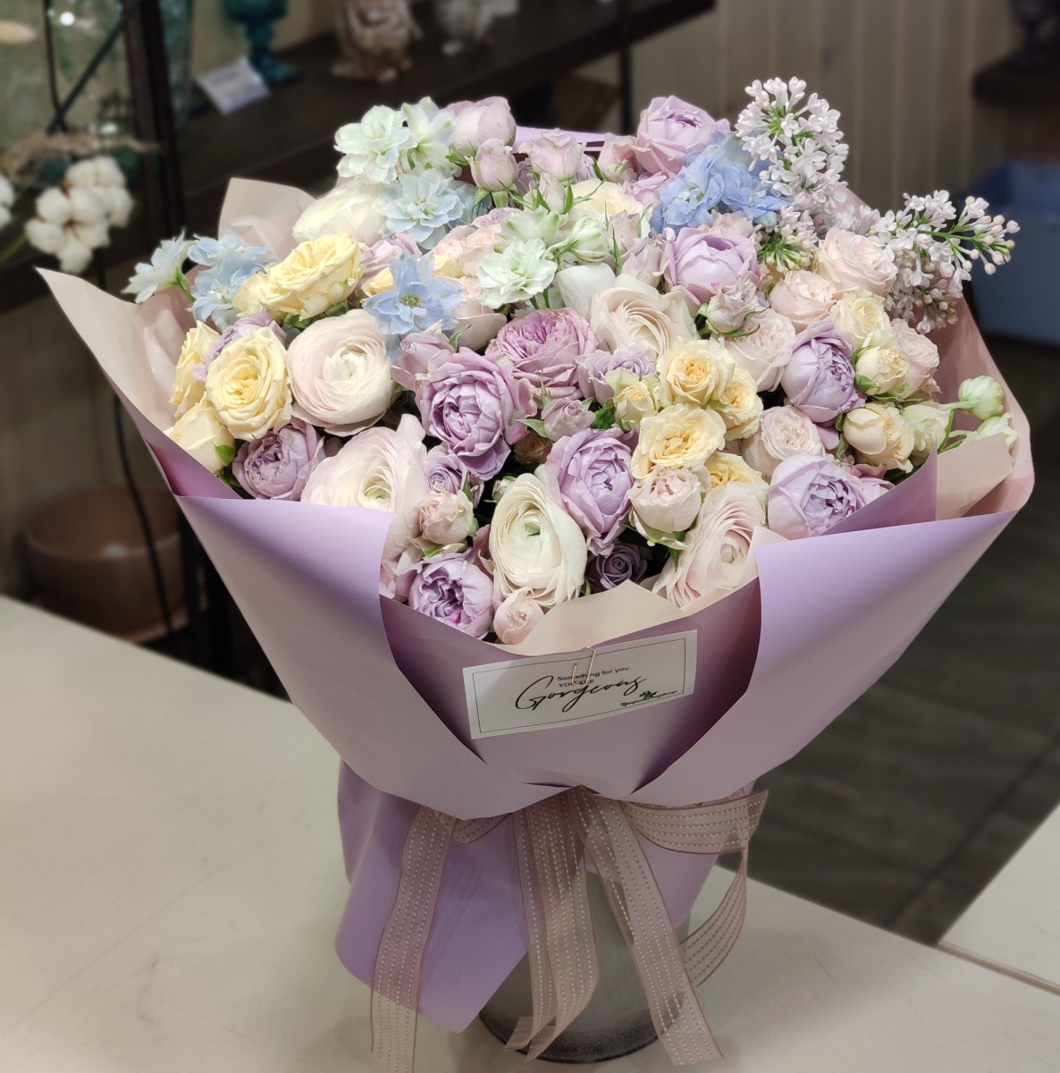 Букет с сиренью, дельфиниумом, садовыми розами и ранункулюсами