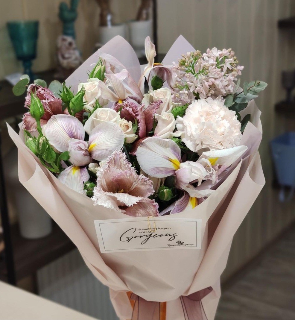 Букет с сиренью, кустовой розой Порселин, тюльпанами и ирисами Брауни