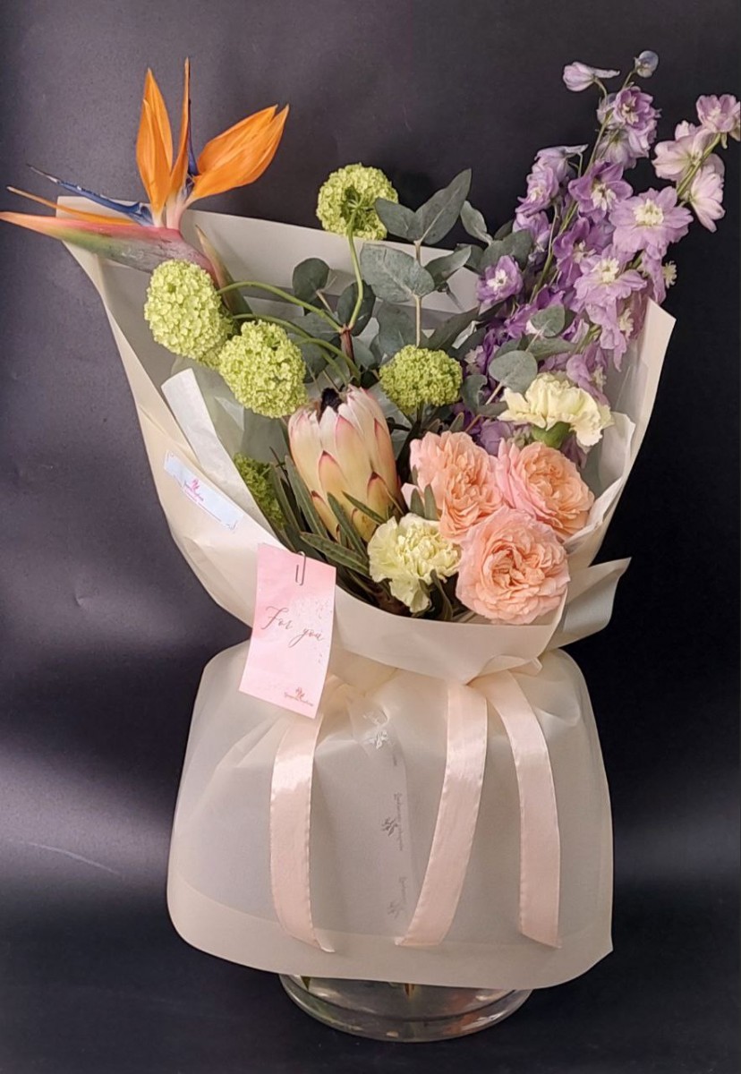 Букет со стрелицией, дельфиниумом, протеей, вибурнумом, пионовидной розой Джульетта, гвоздиками