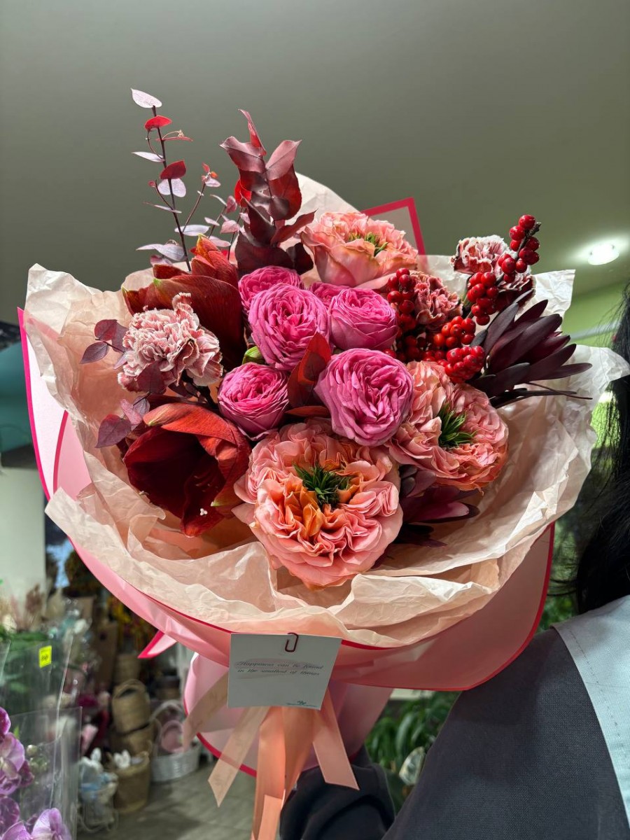 Букет (роза rустовая Жизель, роза Мандарин, амариллис, гвоздика Браун молли, леукодендрон, илекс, эвкалипт крашенный