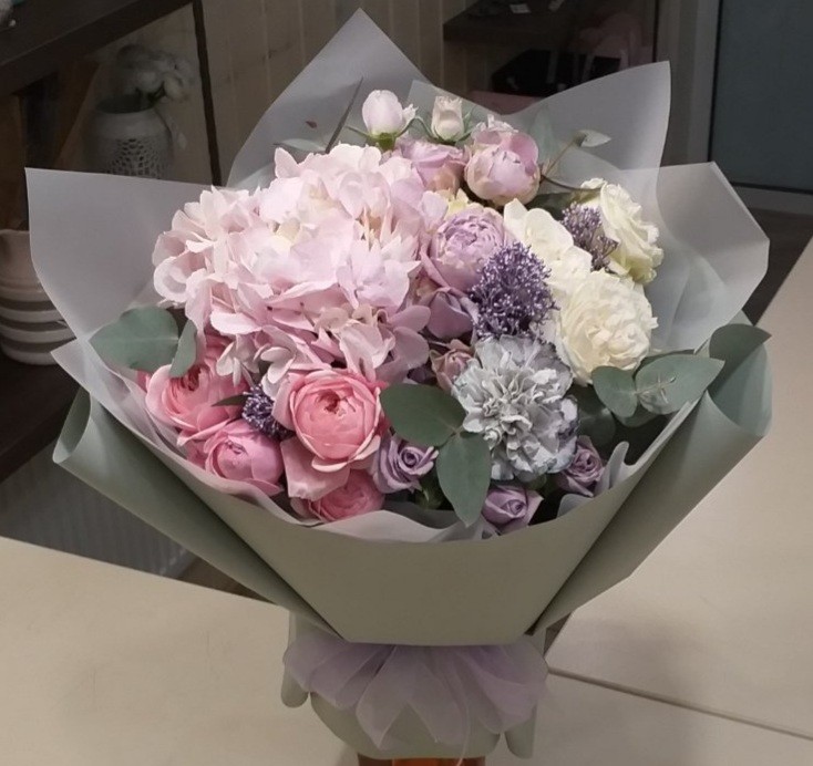 Букет с гортензией, садовыми розами, скиммией и гвоздикой
