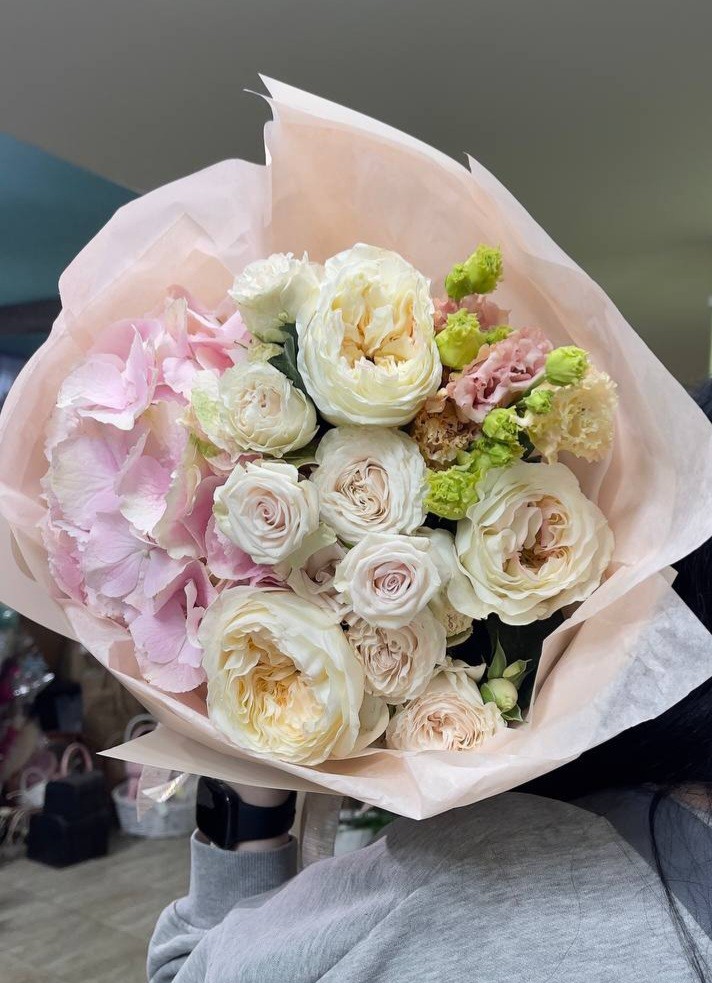 Букет из гортензии, роз Вики гарденс, кустовой розы и эустомы