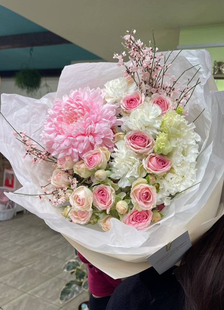 Букет из хризантемы, кустовой розы, диантусов и генисты