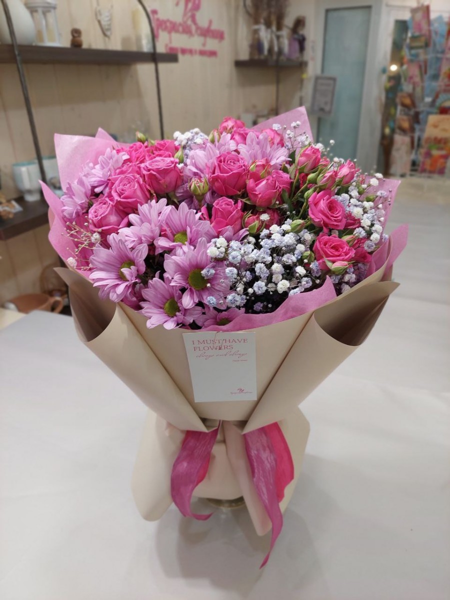 Букет из кустовых роз, хризантем и гипсофилы