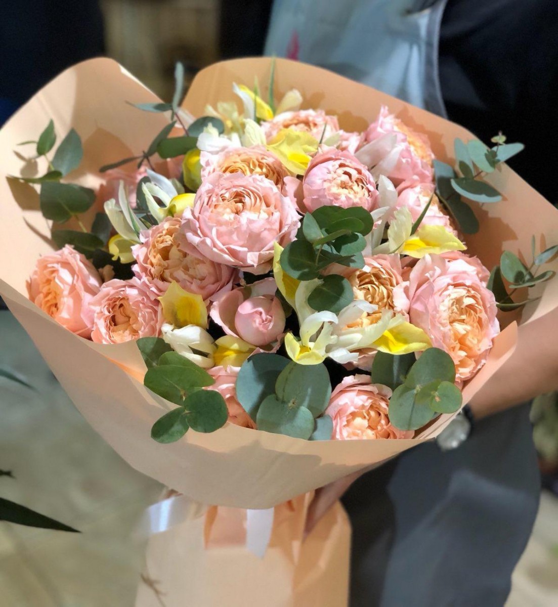 Букет из пионовидной розочки Джульетта, желтых ирисов и эвкалипта