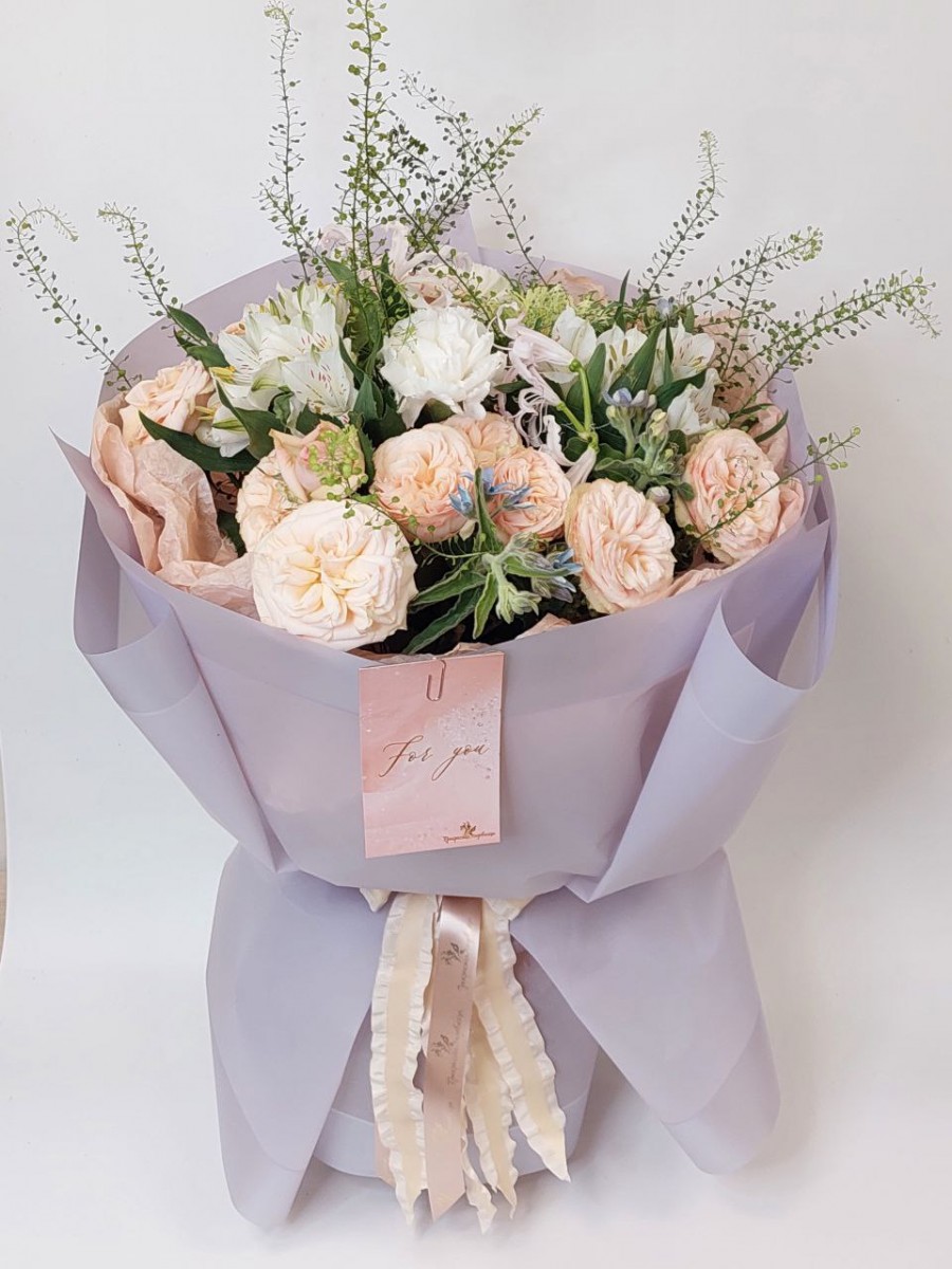 Букет из пионовидных роз, гвоздик и альстромерии