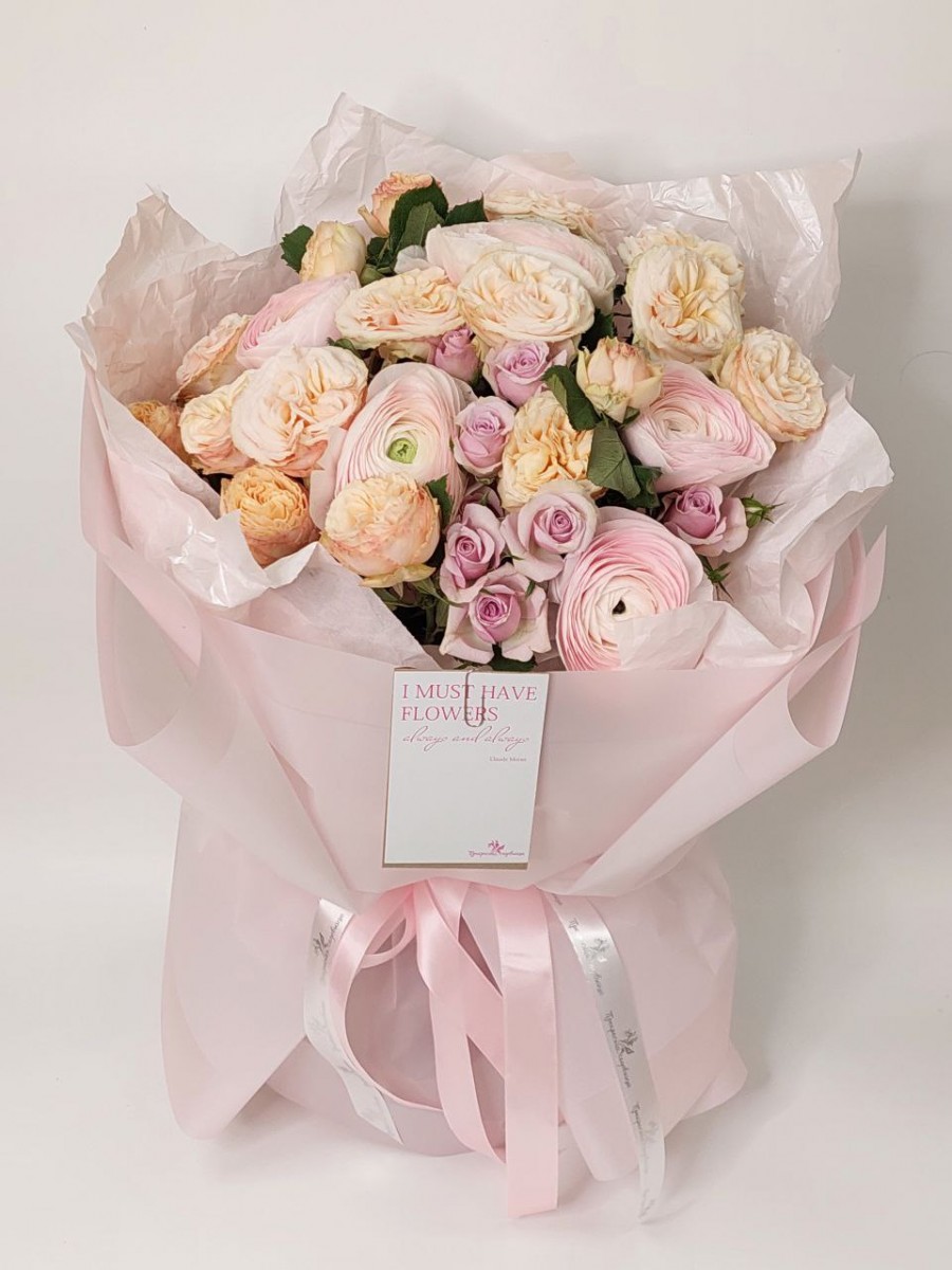 Букет из ранункулюсов и роз разных сортов