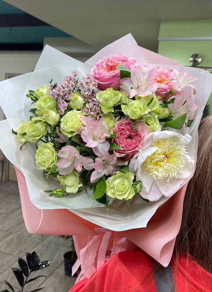 Букет из роз Пинк монстер, пиона, кустовой розы, альстромерии и хамелациума