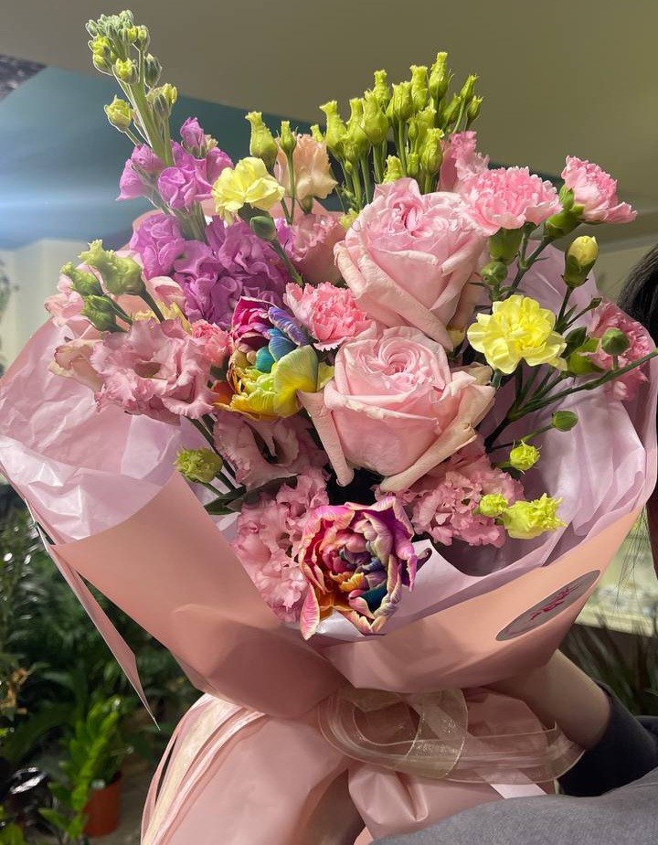 Букет из тюльпанов, роз Пинк Охара, гвоздики Шабо, эустомы и маттиолы