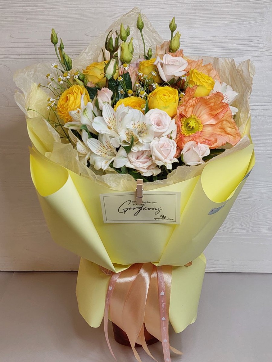 Букет маком, розами пионовидными, альстромерией и эустомой