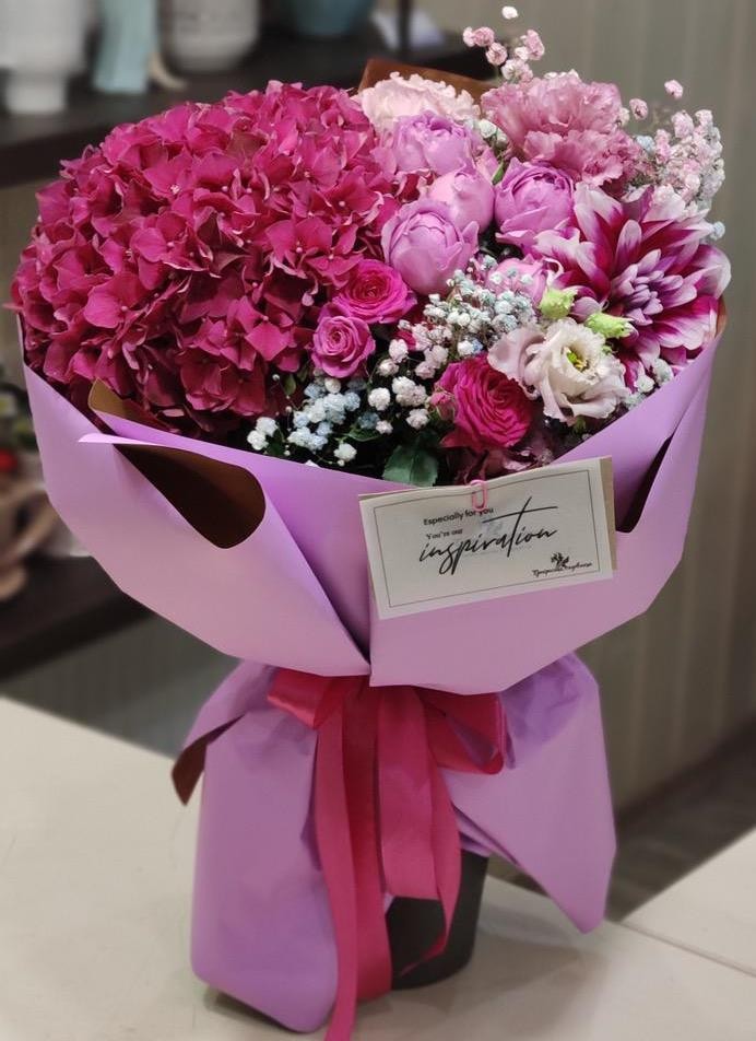 Букет малиновый с гортензией, садовыми розами, сезонными георгинами и гипсофилой