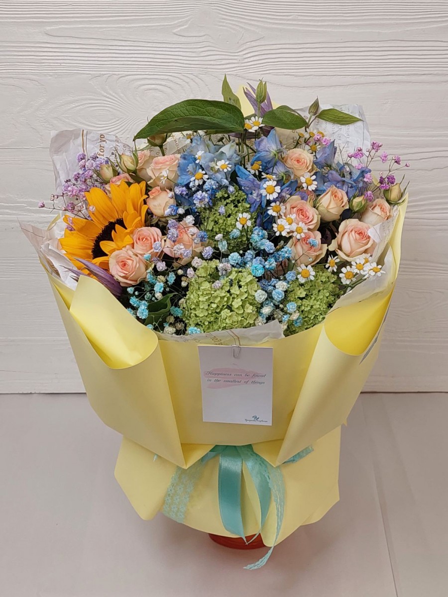 Букет с дельфиниумом, гипсофилой, вибурнумом, кустовыми розами, подсолнухом