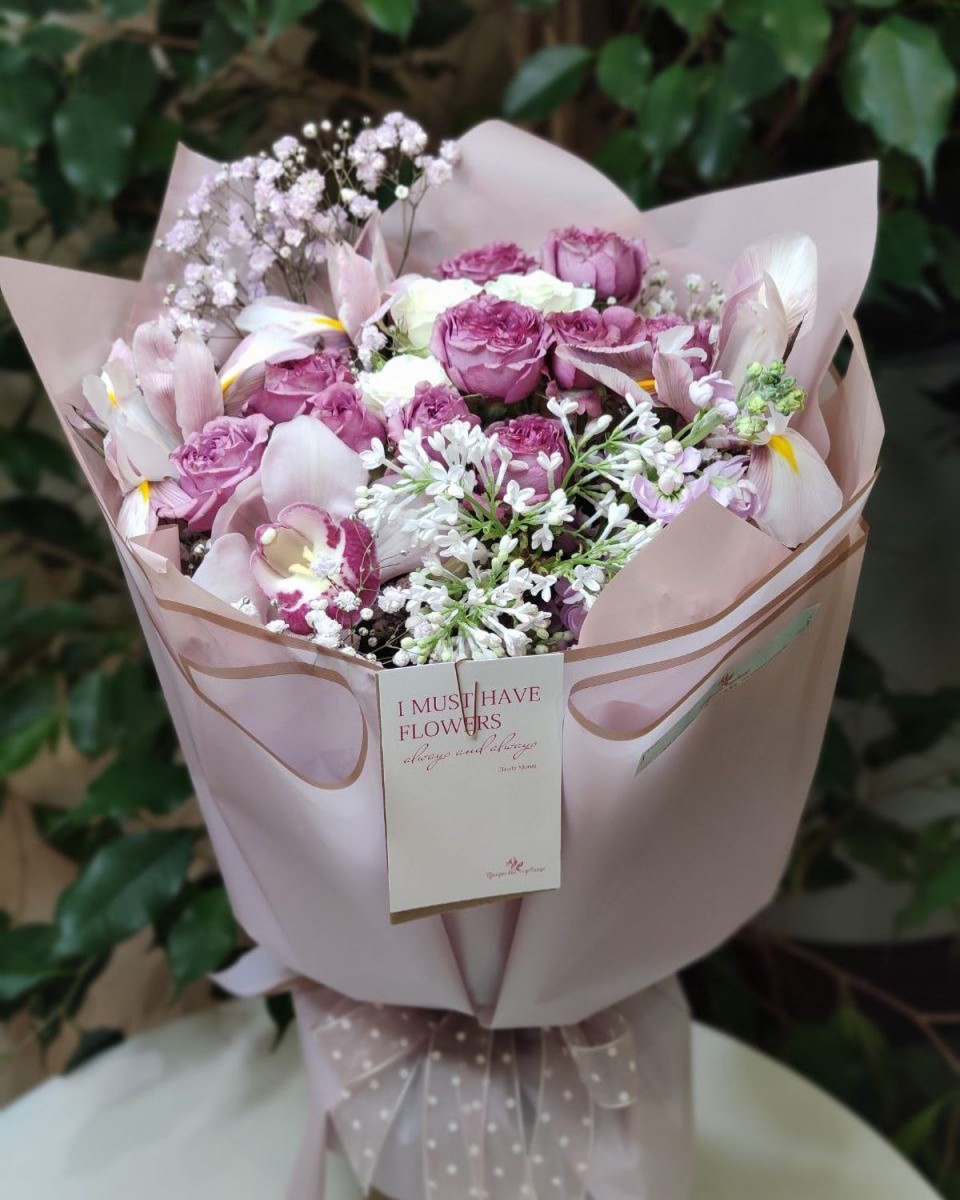 Букет с ароматной сиренью и пионовидными розами