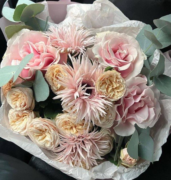Букет с французскими и пионовидными розами, герберами и эвкалиптом