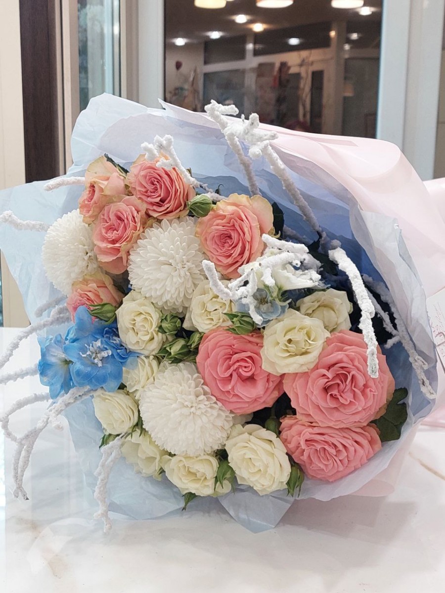 Букет с французскими розами, хризантемами и дельфиниумом