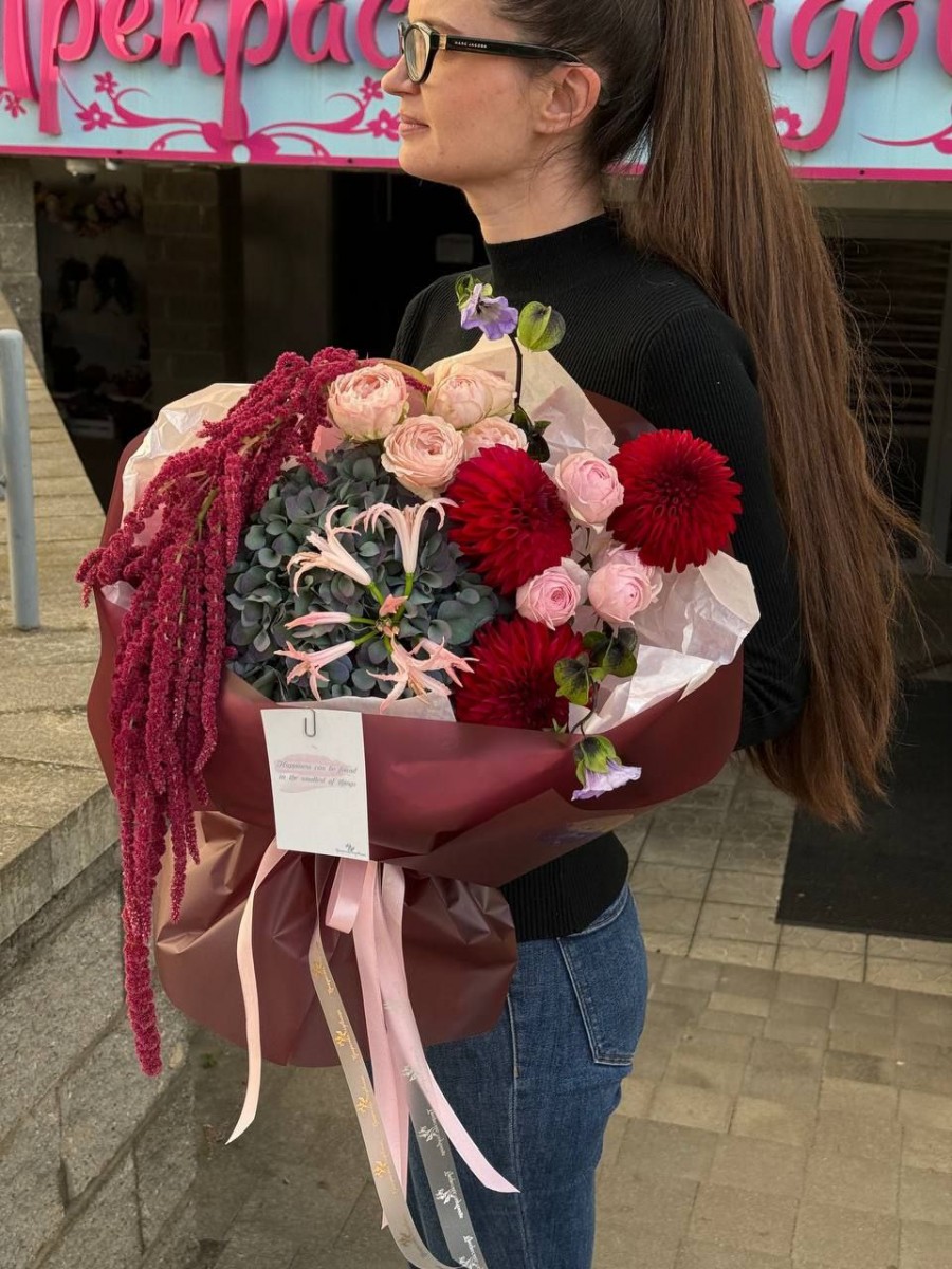 Букет с георгинами, пионовидными розами Менсфилд Пинк, амарантом, гортензией, нерине, физалисом