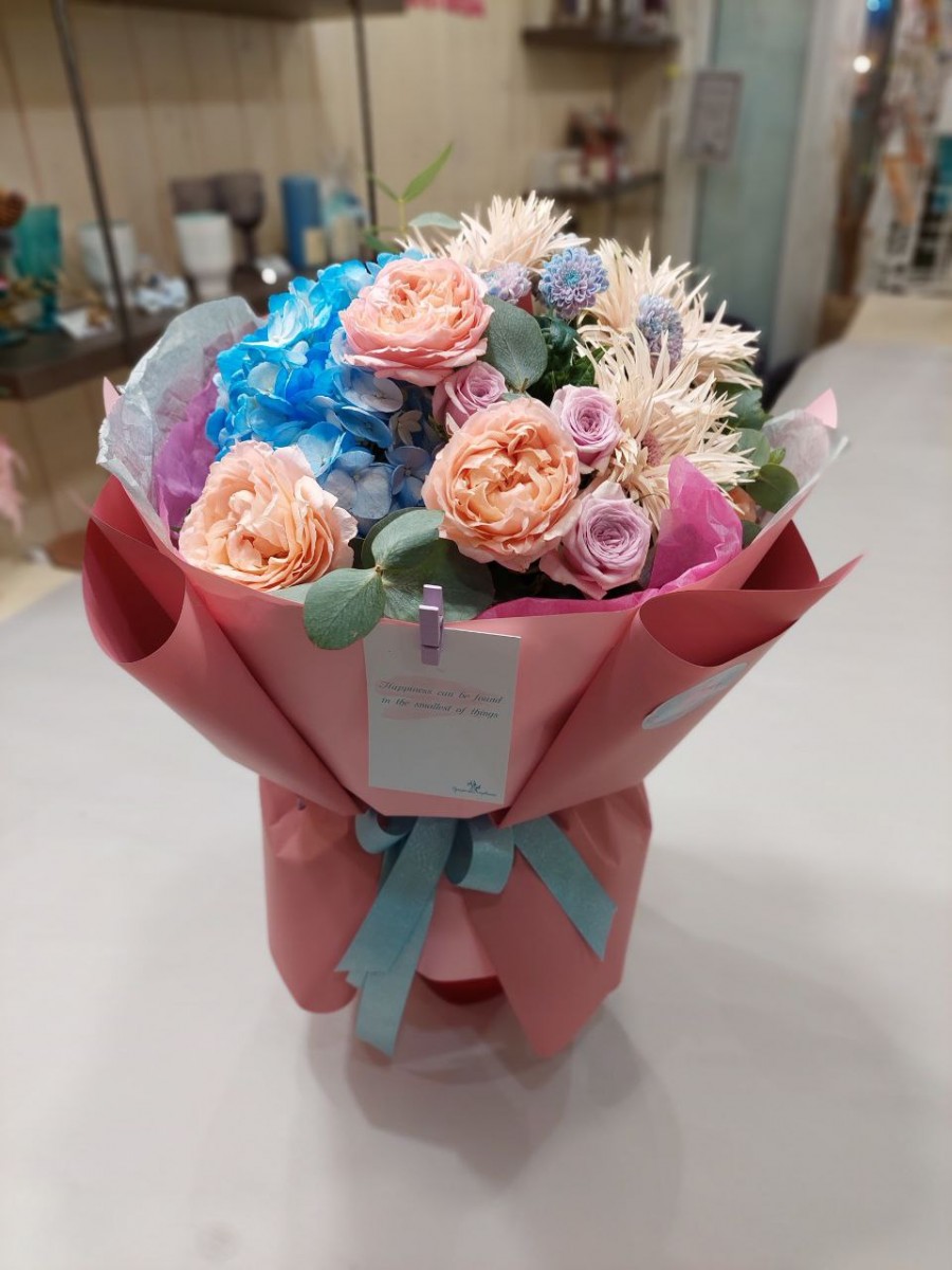 Букет с герберами, гортензией, пионовидными и кустовыми розами
