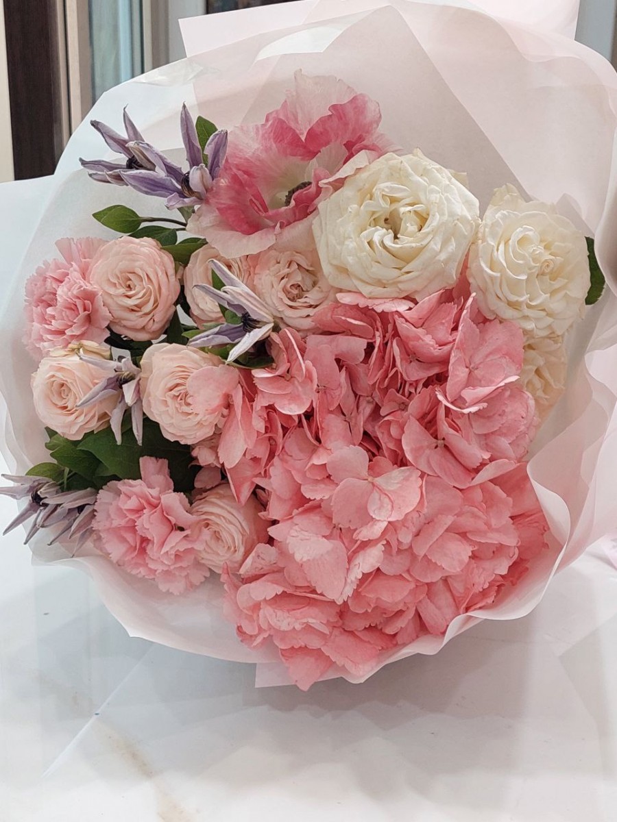 Букет с гортензией, розами Бомбастик, анемонами, клематисом, гвоздиками
