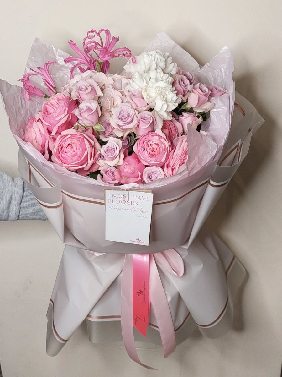 Букет с гортензией, пионовидными розами, гвоздиками, нерине, кустовой розой