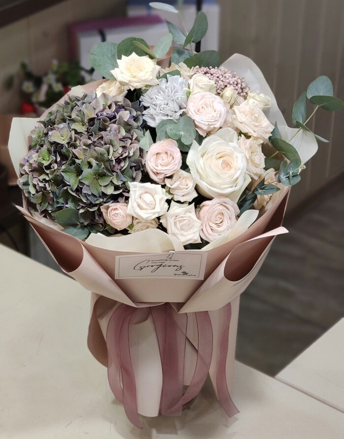 Букет с гортензией, садовыми и кустовыми розами, гвоздикой и озотамнусом
