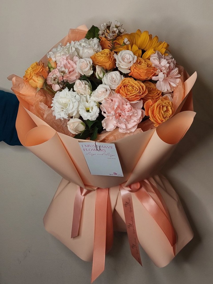 Букет с гвоздиками, розами, подсолнухом и эустомой