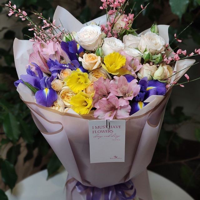 Букет с ирисами, нарциссами, альстромерией, генистой и кустовой садовой розой