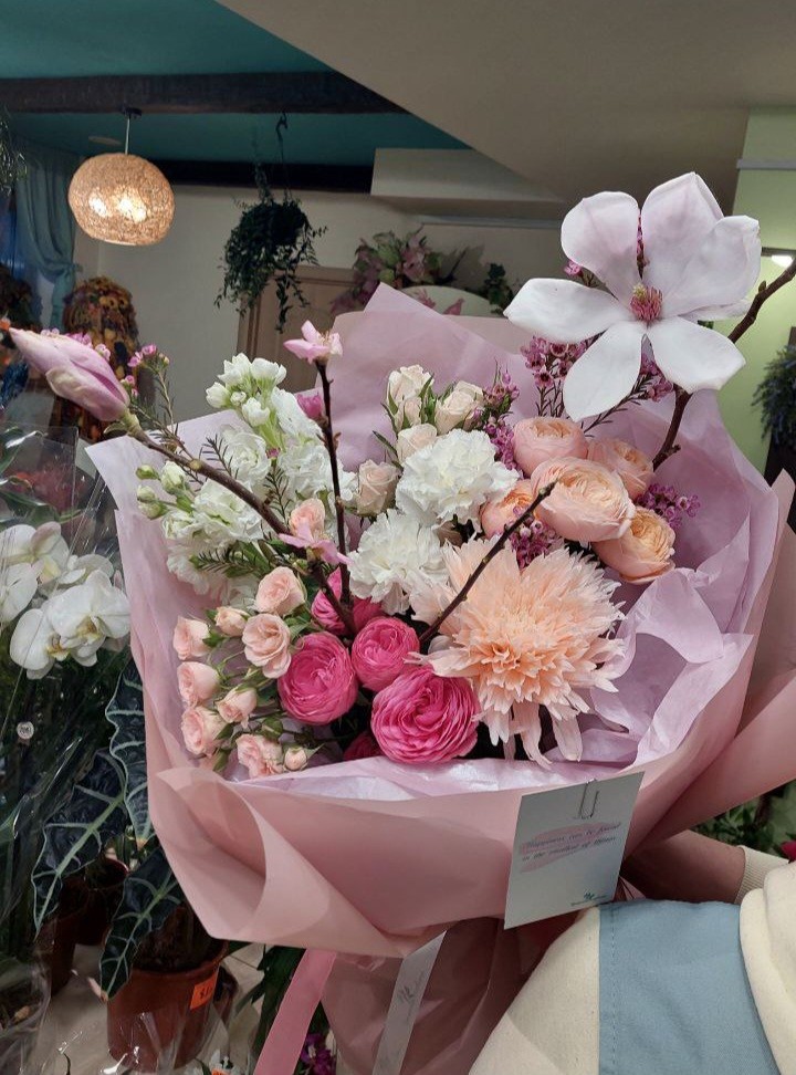 Букет с магнолией, розами Жизель, Леди Элла, Свит Сара, хризантемами Спайдер пич, хамелациумом, прунусом