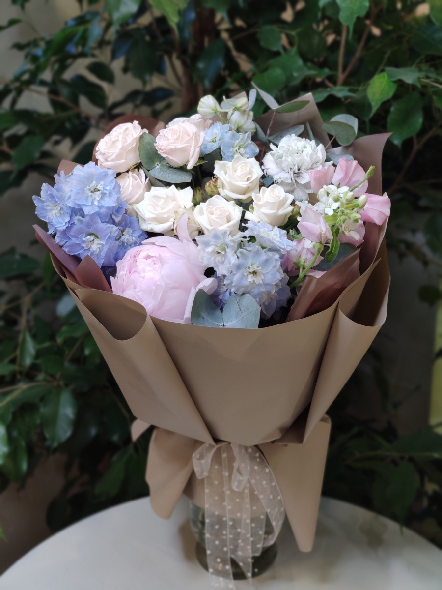 Букет с пионами, дельфиниумом Деви Боуи и кустовой розой