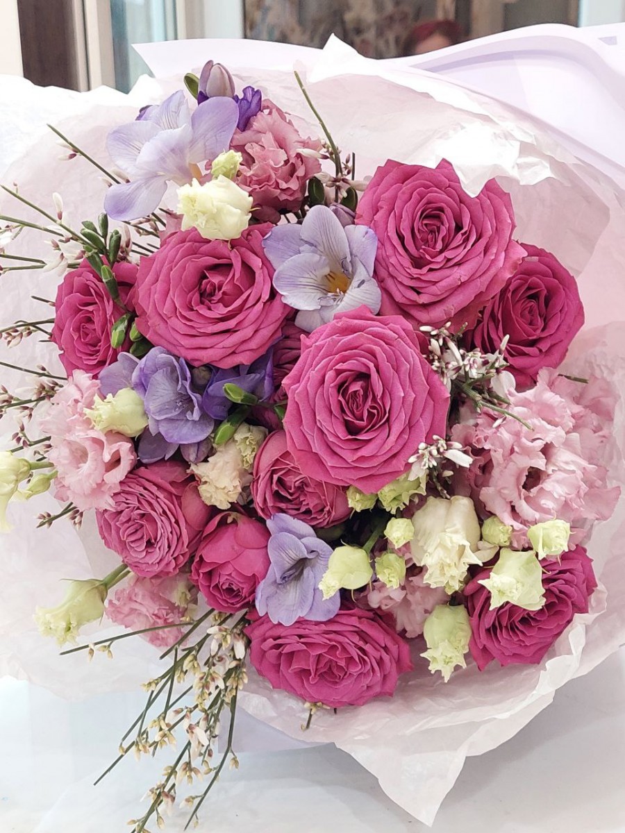 Букет с пионовидными розами, эустомой, фрэзией и генистой