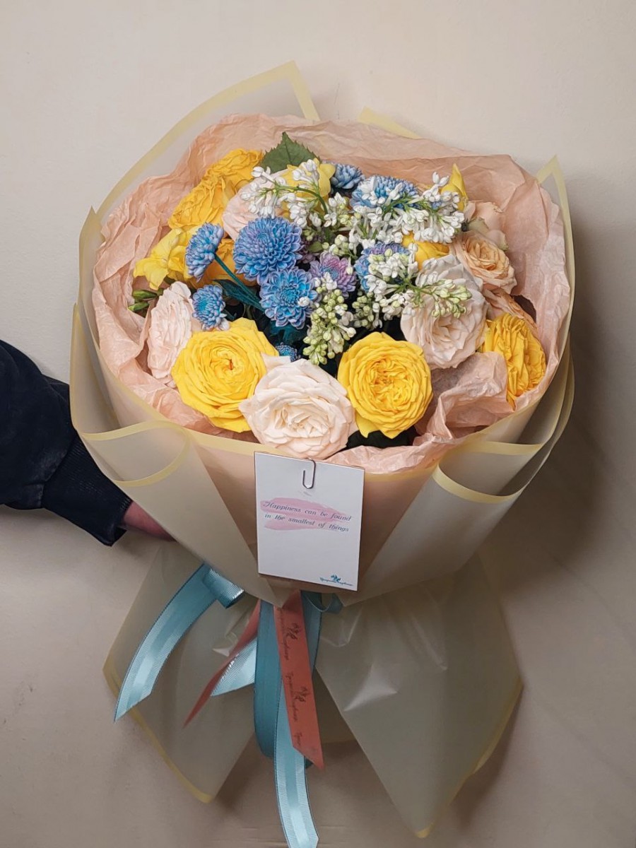Букет с пионовидными розами, хризантемами и сиренью
