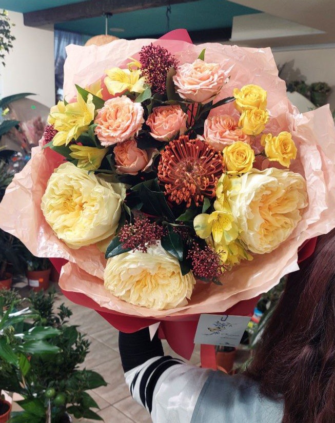 Букет с пионовидными розами Крем экспрешн, нутаном, альстромерией, кустовыми розами, скиммией