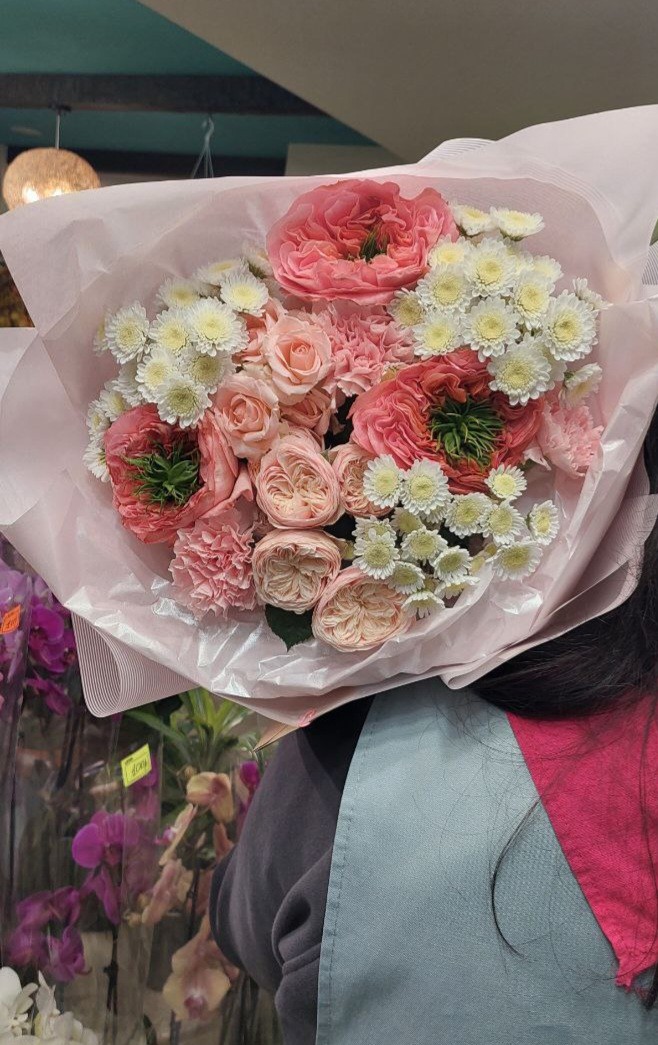 Букет с пионовидными розами Мандарин, Роял блаш, диантусами, хризантемами Сталлион