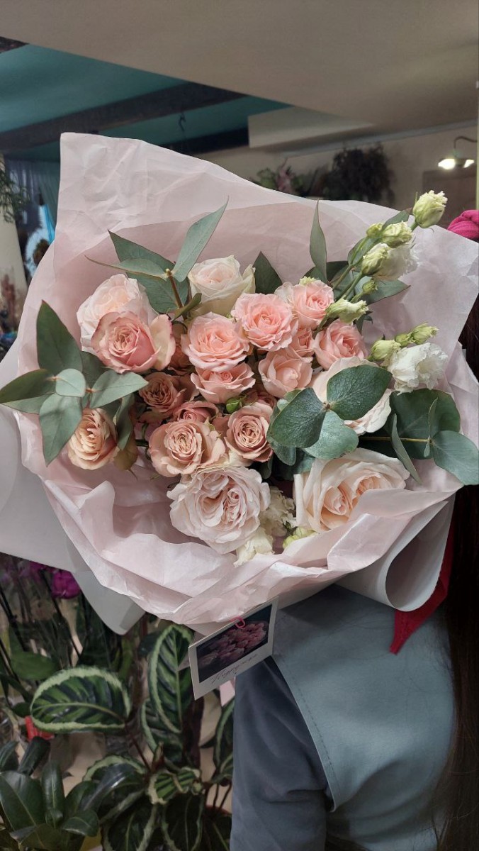 Букет с пионовидными розами Вайт Охара, Дастини, кустовой розой, эустомой и эвкалиптом
