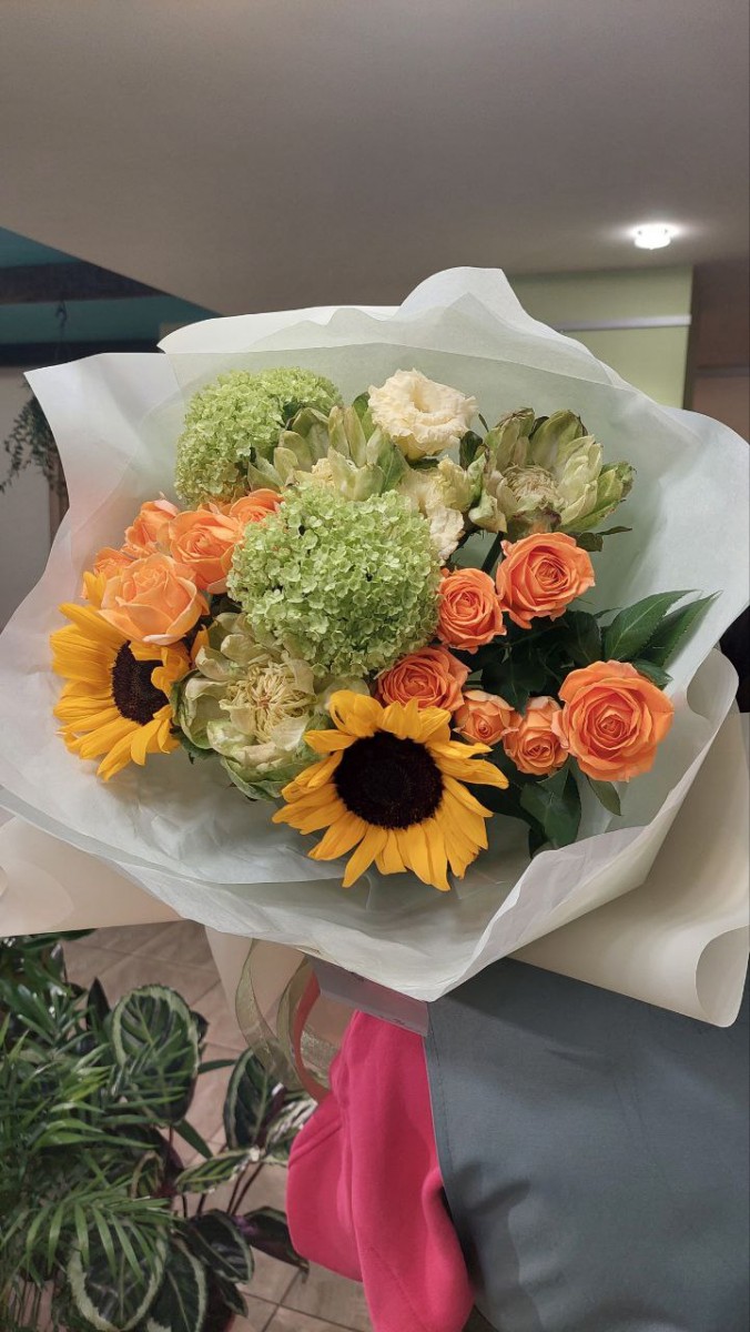 Букет с подсолнухами, вибурнумом, пионоаидной розой Коралл Шарм, розами Вегги