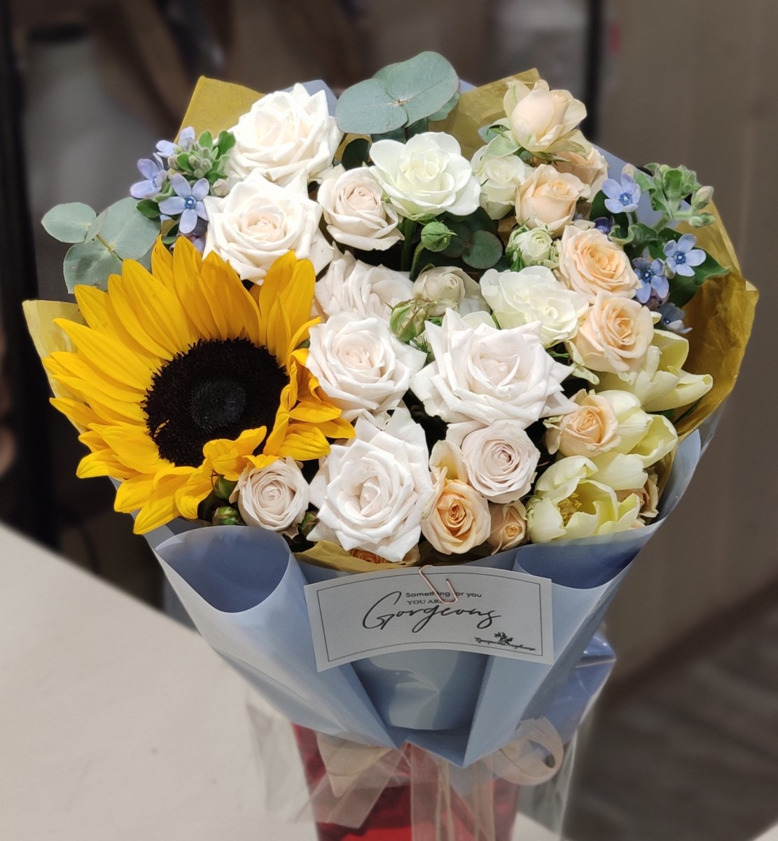 Букет с подсолнухом, кустовыми розочками и твидией