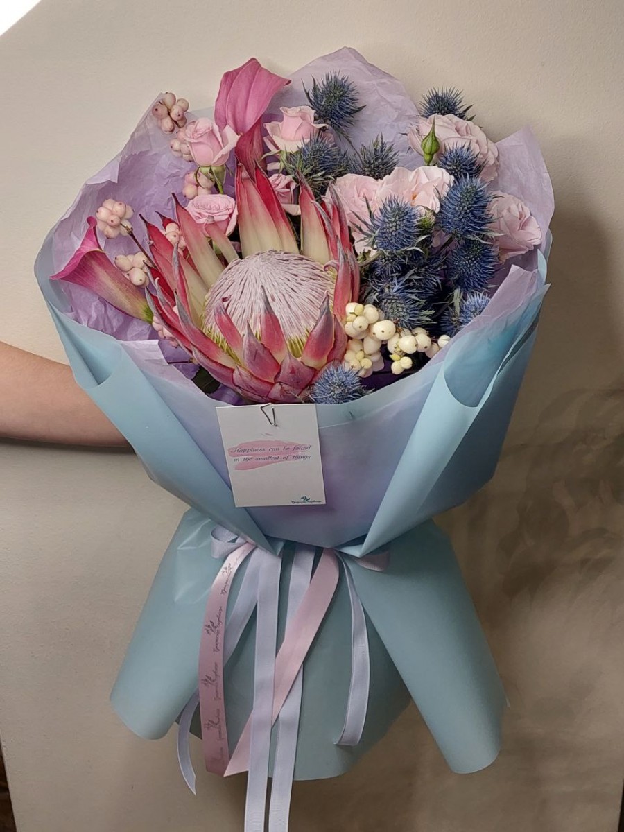 Букет с протеей, французскими и кустовыми розами, каллами, эрингиумом