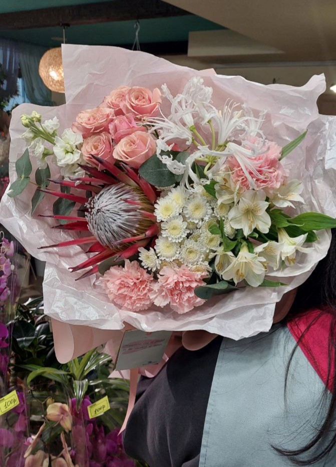 Букет с протеей, пионовидными розами Дестини, нерине, маттиолой, альстромерией, гвоздиками, кустовыми хризантемами