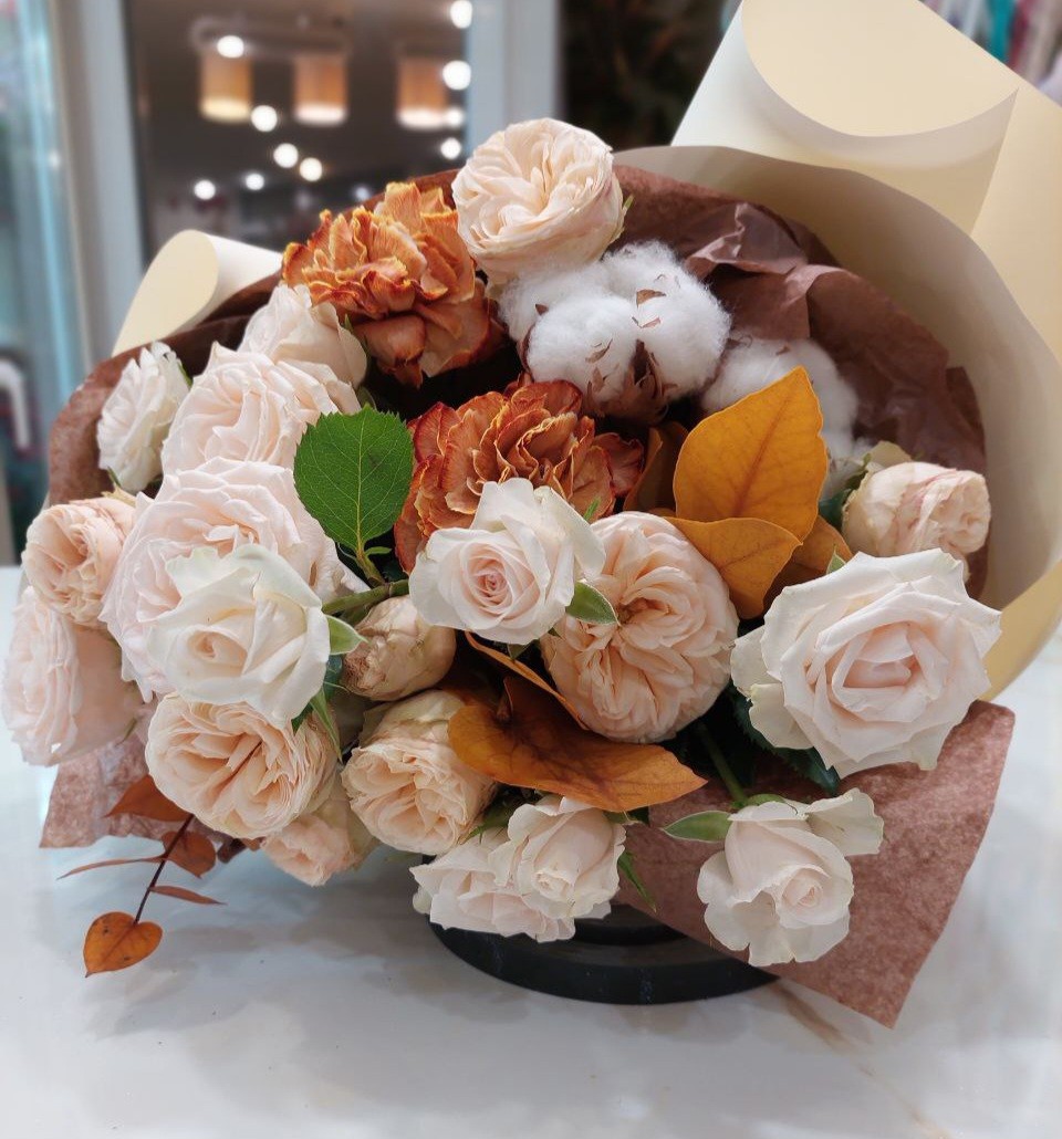 Букет с розами Джентл Трендсеттер, диантусом, хлопком и крашенным эвкалиптом