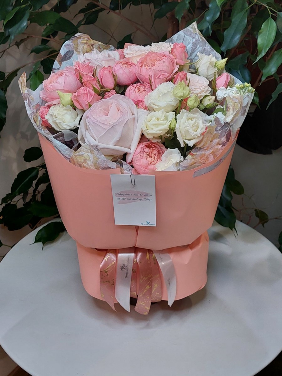 Букет с розами Вайт О'Хара, кустовой пионовидной розой и эустомой.