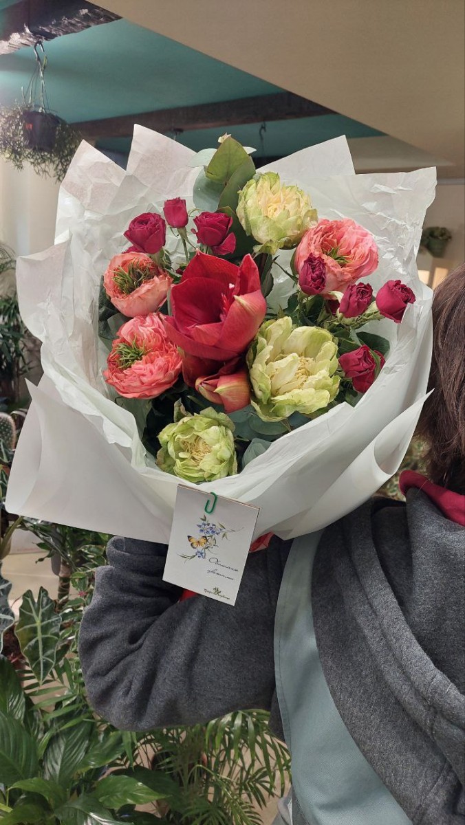 Букет с розами Вегги, Мандарин и Ред Трендсеттер, амарилисами, эвкалиптом
