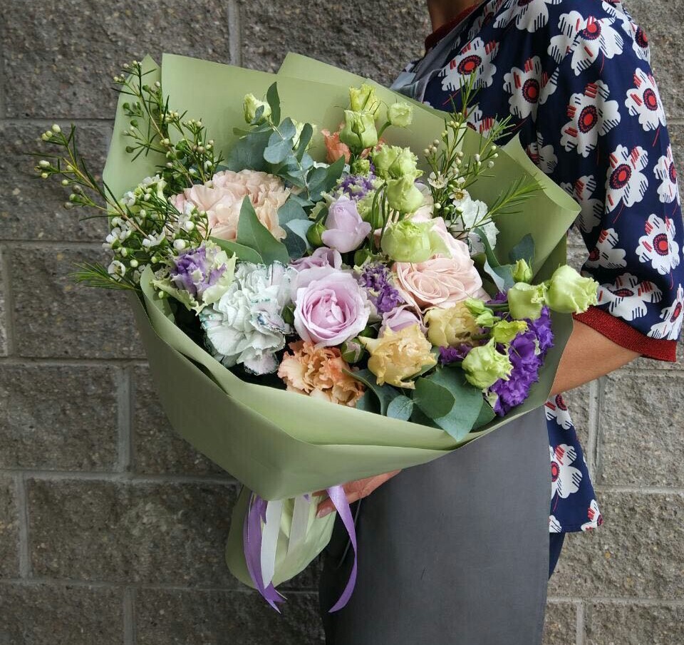 Букет с садовыми розами, лизиантусом и хамелациумом