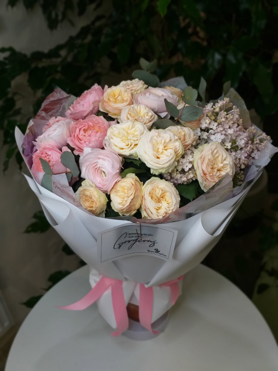 Букет с сиренью, ранункулюсами, садовыми розами и эвкалиптом