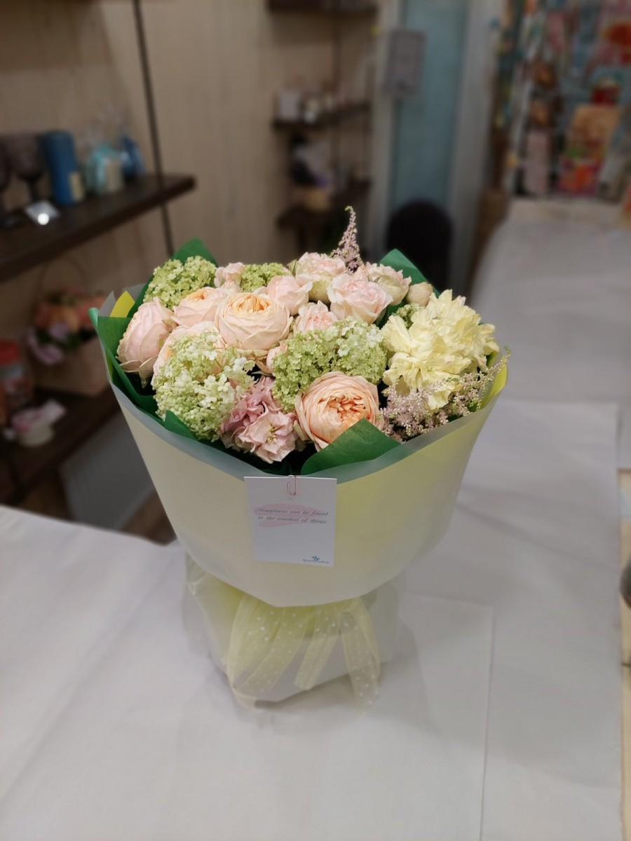 Букет с вибурнумом, пионовидными розами, астильбой и гвоздикой