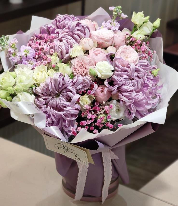 Букет в нежной цветовой гамме с розами, маттиолой и хризантемой Виенна