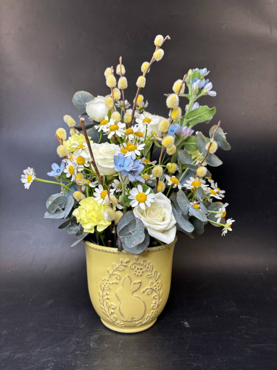 Пасхальная композиция из веточек вербы, роз, танацетума, твидии и эвкалипта