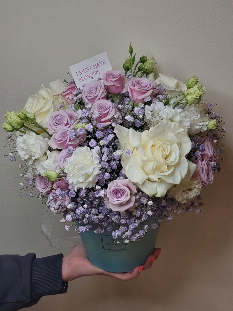 Цветочная композиция в конусной коробке с французскими розами, кустовыми розами, эустомой и гипсофилой