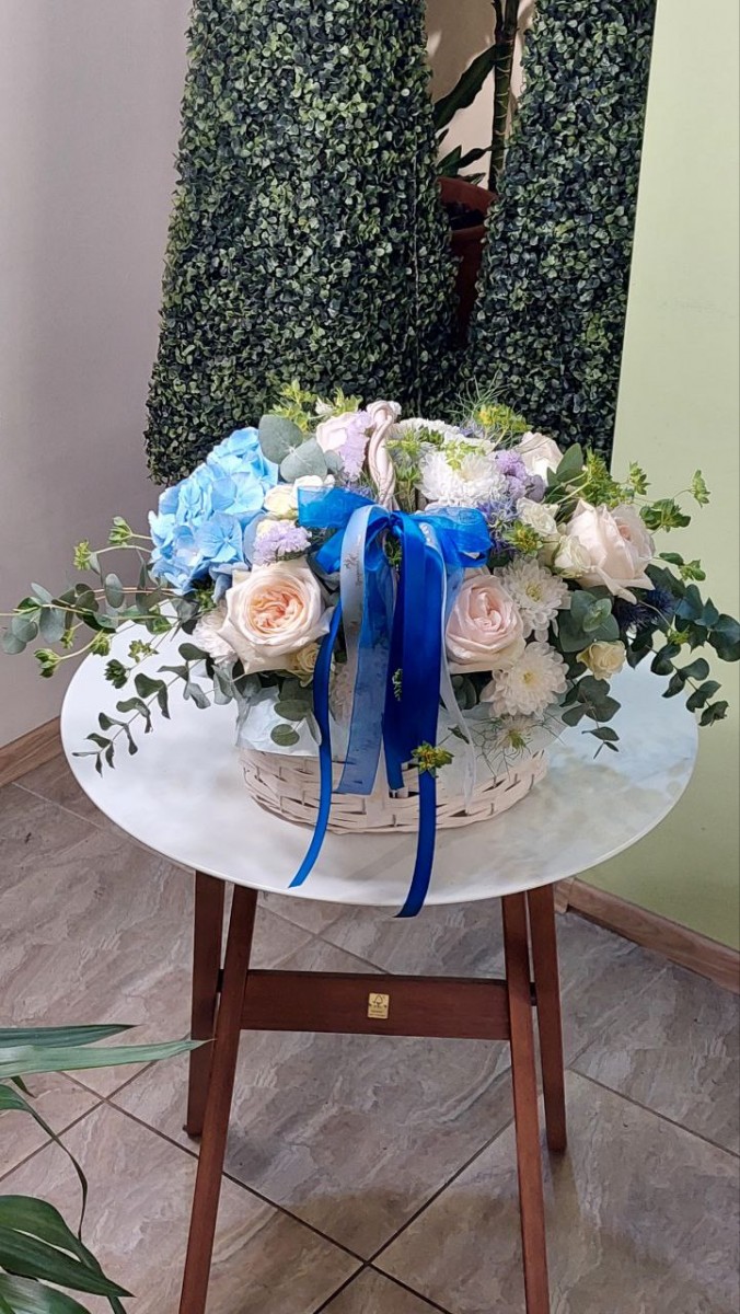 Цветочная композиция в корзинке с гортензией, пионовидными розами Вайт охара, статицей, кустовыми хризантемами, эвкалиптом, эрингиумом, буплерумом
