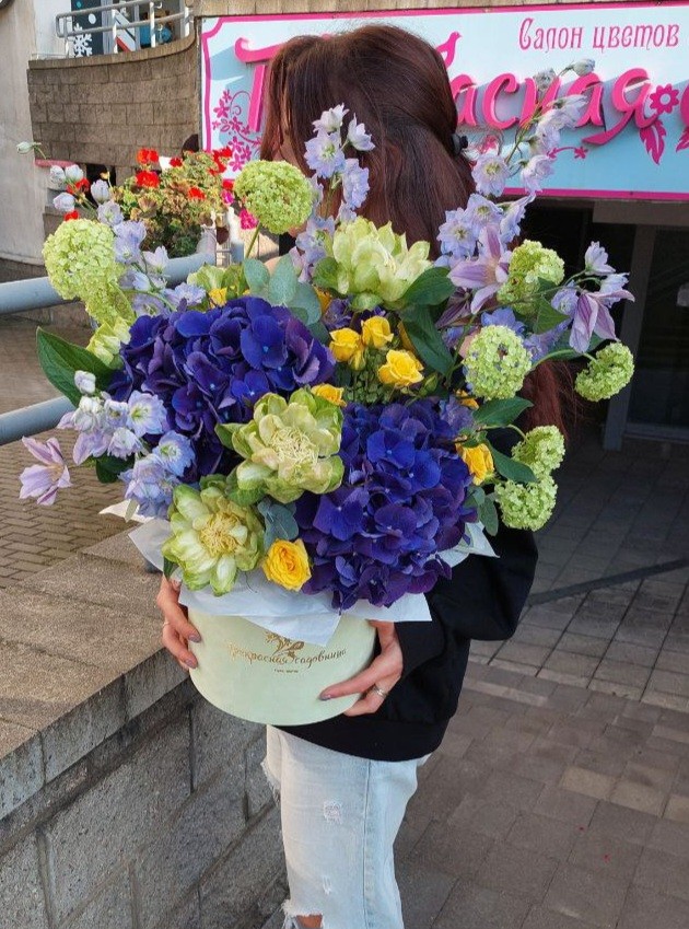 Цветочная композиция в шляпной коробке с гортензиец, дельфиниумом, вибурнумом, розами Вегги, клематисами, кустовыми розами Еллоу бейби