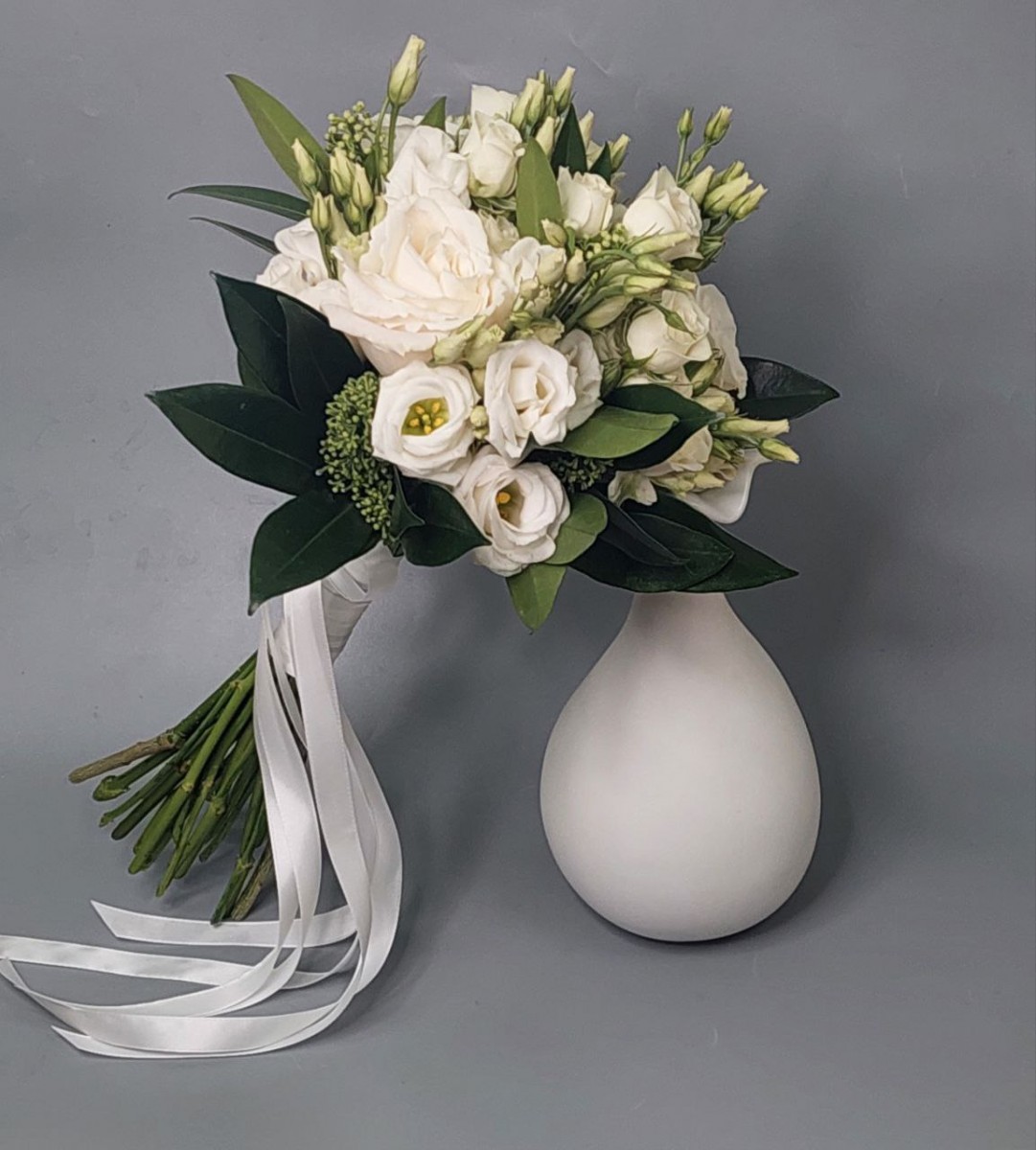 Свадебный букет из роз Плая бланка, эустомы, скиммии