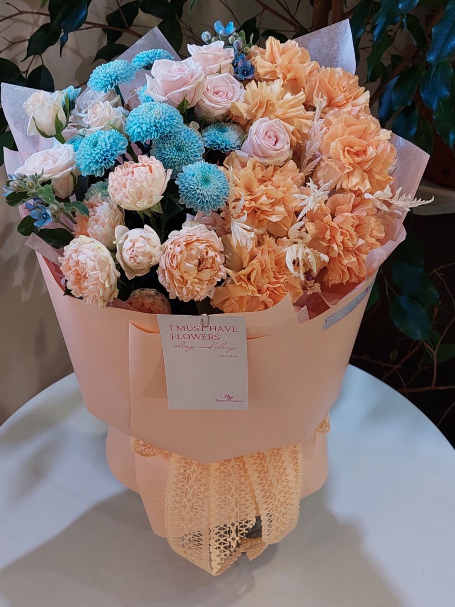 Букет из гвоздик, хризантем, кустовых роз и твидии